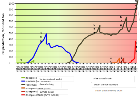 Thermal mining development (industrial) from 1972 – till now. По Developed blocks ORF = 0,51, steam to oil ratio 2,68 t/t.